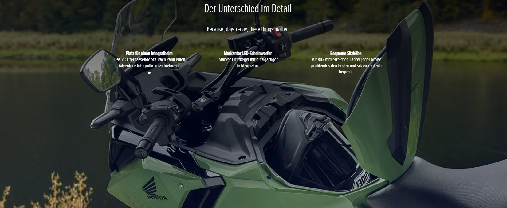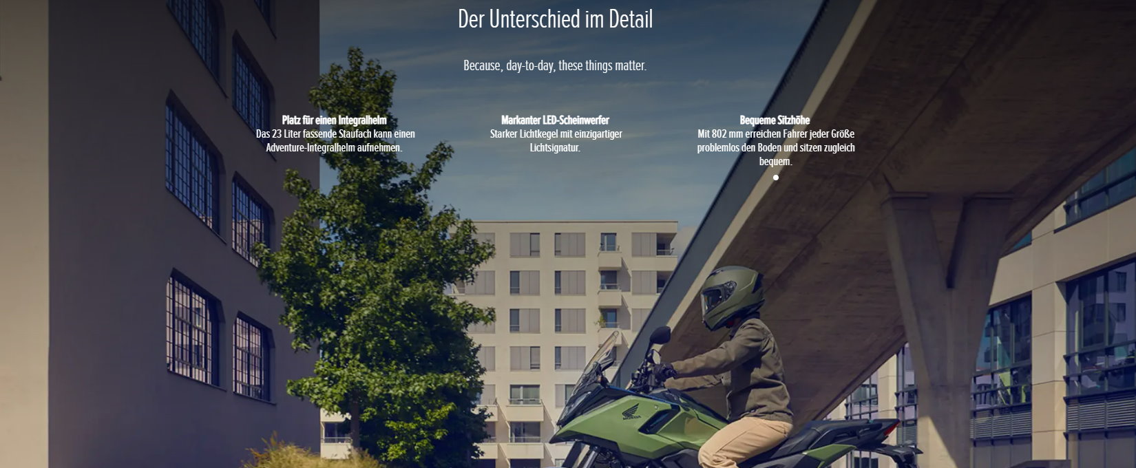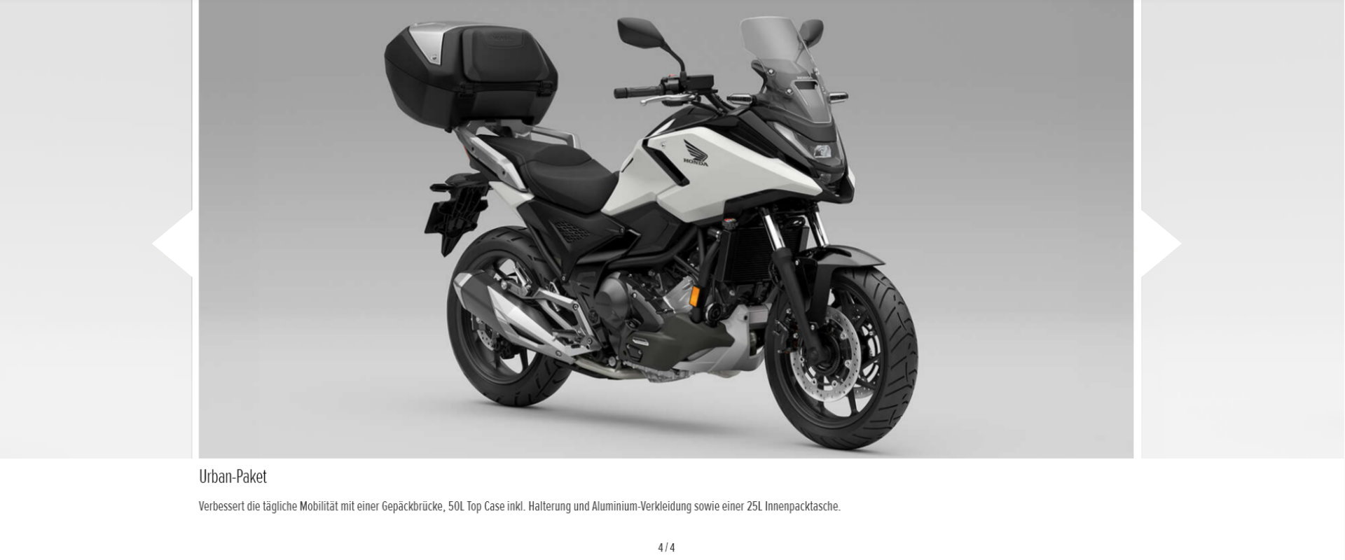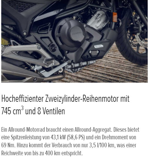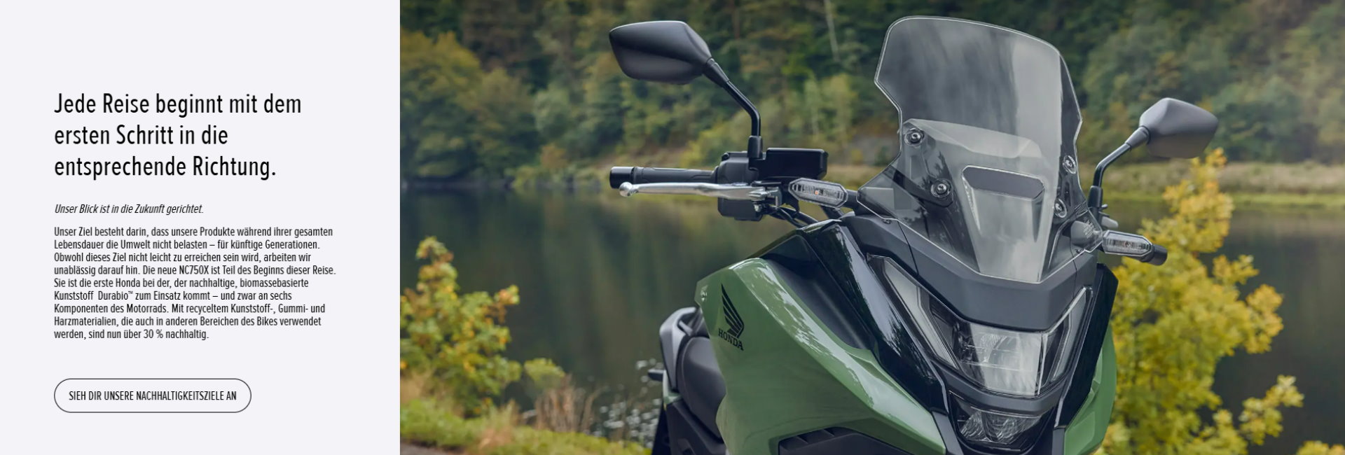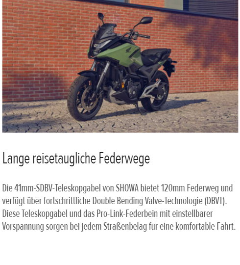 Dein neues Motorrad soll ein vielseitiger Allrounder werden? Dann hast du das richtige gefunden: Die NC750X mit langen Federwegen und Zweizylindermotor eignet sich perfekt für den Weg zur Arbeit, Touren und alles, was dazwischen liegt. Dazu gibt es jetzt ein neues Modell. Das robuste Design ist mit dem neu gestalteten LED-Scheinwerfer und dem neuen 5-Zoll TFT-Display mit Smartphone-Konnektivität per Honda RoadSync noch markanter. Das Vorderrad ist jetzt mit einer Doppelscheibenbremse mit verbesserter Bremsleistung ausgestattet. Bei der Verkleidung kommt nachhaltiges, farbiges Durabio™ zum Einsatz. Außerdem überrascht die NC750X mit einem versteckten Extra: 23 Liter Stauraum, genug für einen Integralhelm.