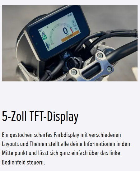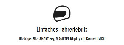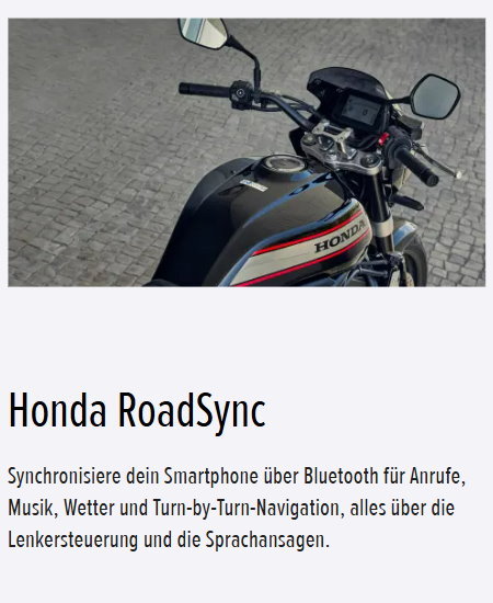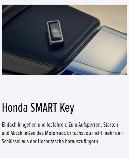 Der 5 Zoll große TFT-Bildschirm bietet intuitive Bedienung über eine Vierwege-Schaltereinheit links am Lenker und dank Optical Bonding beste Ablesbarkeit auch bei hellem Sonnenlicht. Honda RoadSync-Smartphone-Konnektivität ist serienmäßig integriert. Die Zündung zur Inbetriebnahme wird benutzerfreundlich über ein Smartkey-System aktiviert.