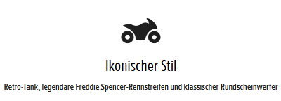 Das Design verkörpert puren 80er-Jahre-Look, ein Jahrzehnt, das unseren Zeitgeist in allen Bereichen – von Musik über Lifestyle bis zur Kleidung – zunehmend beeinflusst. Die schwungvolle Linienführung verläuft vom Tank über die Seitendeckel bis zur Heckverkleidung. Retro-typisch sind ebenfalls der klassisch runde Scheinwerfer und zwei Hupen darunter, zackig markantes Streifendekor und die 4-2-1-Auspuffanlage mitsamt Megaphon-Schalldämpfer.