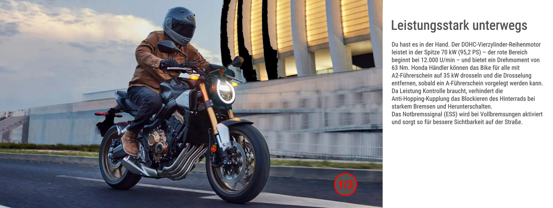 Du hast es in der Hand. Der DOHC-Vierzylinder-Reihenmotor leistet in der Spitze 70 kW (95,2 PS) – der rote Bereich beginnt bei 12.000 U/min – und bietet ein Drehmoment von 63 Nm. Honda Händler können das Bike für alle mit A2-Führerschein auf 35 kW drosseln und die Drosselung entfernen, sobald ein A1-Führerschein vorgelegt werden kann. Da Leistung Kontrolle braucht, verhindert die Anti-Hopping-Kupplung das Blockieren des Hinterrads bei starkem Bremsen und Herunterschalten. Das Notbremssignal (ESS) wird bei Vollbremsungen aktiviert und sorgt so für bessere Sichtbarkeit auf der Straße.