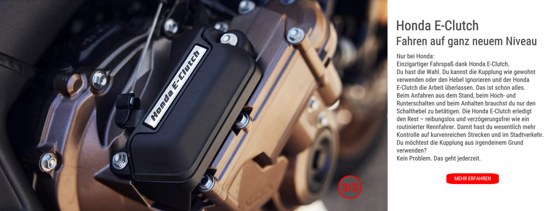 Vierzylindermagie pur. Die aufs Wesentliche reduzierte CB650R überzeugt im Stadtverkehr und auf der Landstraße durch herausragende Beschleunigung, agile Leichtigkeit und das unverwechselbare, von der CB1000R inspirierte Neo Sports Café-Design. Hinzu kommen erstklassige Technik und das herausragende als Sonderausstattung erhältliche neue Honda E-Clutch.