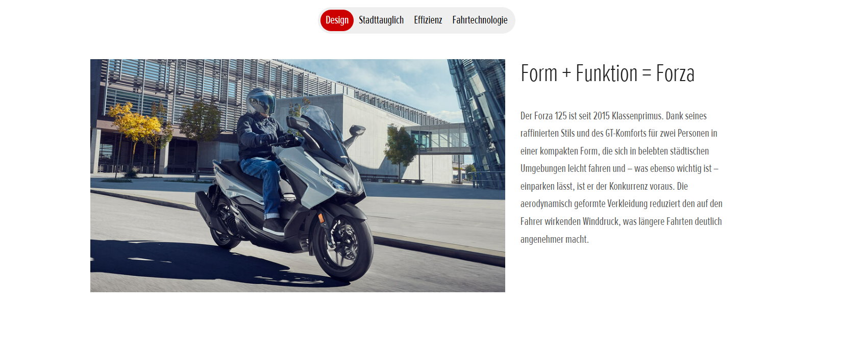 Der Forza 125 ist unser Premium-Sport-GT-Roller, der alles bietet, was du brauchst und noch mehr. Erlebe die hervorragende Kraftstoffeffizienz und die beeindruckende Reichweite des eSP+-Motors, der in seiner Klasse führend ist. Ausgestattet mit einem 5-Zoll TFT-Display und der Honda RoadSync-Integration ist der Forza 125 wie geschaffen für das Stadtleben. Verwalte mühelos Telefonanrufe, Musik und Navigation auf einem Roller, der mit deinem urbanen Lebensstil mithalten kann.