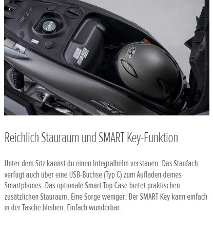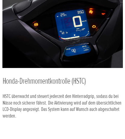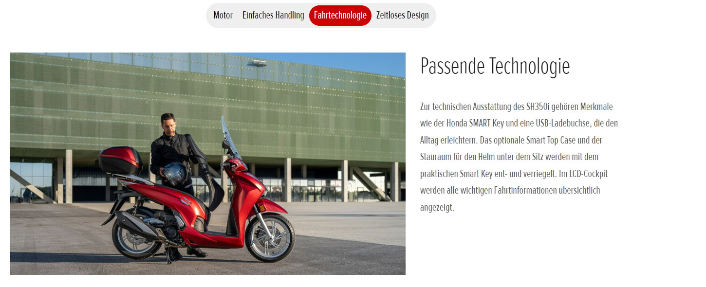 Zur technischen Ausstattung des SH350i gehören Merkmale wie der Honda SMART Key und eine USB-Ladebuchse, die den Alltag erleichtern. Das serienmäßige Smart Top Case und der Stauraum für den Helm unter dem Sitz werden mit dem praktischen Smart Key ent- und verriegelt. Im LCD-Cockpit werden alle wichtigen Fahrtinformationen übersichtlich angezeigt.