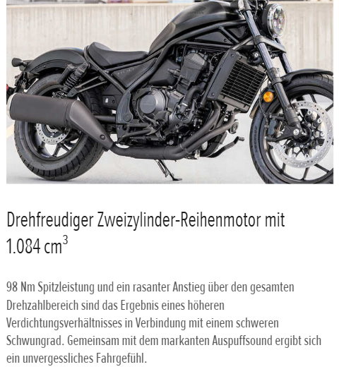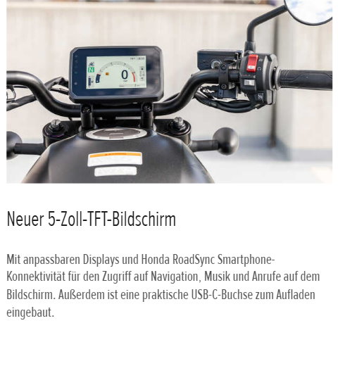 Es geht nicht nur darum, wo du gewesen bist. Es geht darum, wohin du gehst. Mit der neuen CMX1100 Rebel bist du auf der Straße unterwegs wie nie zuvor. Der charakterstarke Zweizylindermotor bringt mehr Leistung im niedrigen bis mittleren Drehzahlbereich mit. Die entspanntere Sitzposition mit erhöhtem und in Richtung des Fahrers nach hinten versetztem Lenker, nach vorn versetzten Fußrasten und 10 mm höherem Sitz bietet mehr Komfort und Sicherheit. Hinzu kommt das neue 5-Zoll-TFT-Display mit Smartphone-Konnektivität per Honda RoadSync, mit dem du unterwegs auf dem Laufenden bleibst.