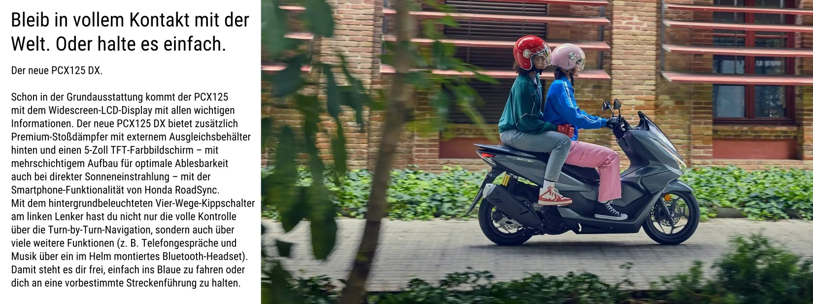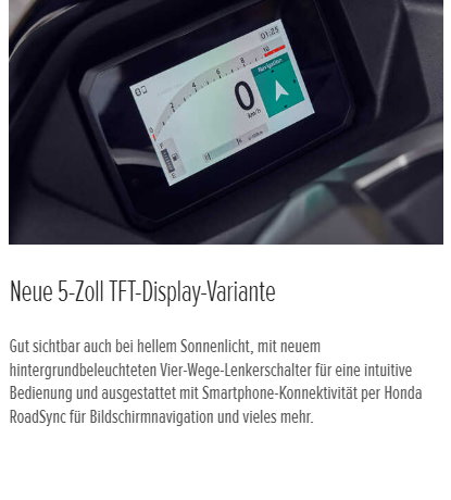 Angetrieben von einem flüssigkeitsgekühlten 4V-Motor, der eine ruhige Beschleunigung liefert und dabei einen erstaunlich niedrigen Kraftstoffverbrauch aufweist. Das intelligent aktualisierte Styling besticht durch futuristische Linien und einen noch umfassenderen Windschutz, aber auch durch eine aktualisierte Scheibenbremse am Hinterrad für verbesserte Bremsleistung. Der neue PCX125 DX verfügt über einen 5-Zoll TFT-Bildschirm mit Honda RoadSync-Smartphone-Konnektivität und intuitiver Lenker-Bedienung sowie über eine aktualisierte hintere Aufhängung für eine noch ruhigere Fahrt in der Stadt.