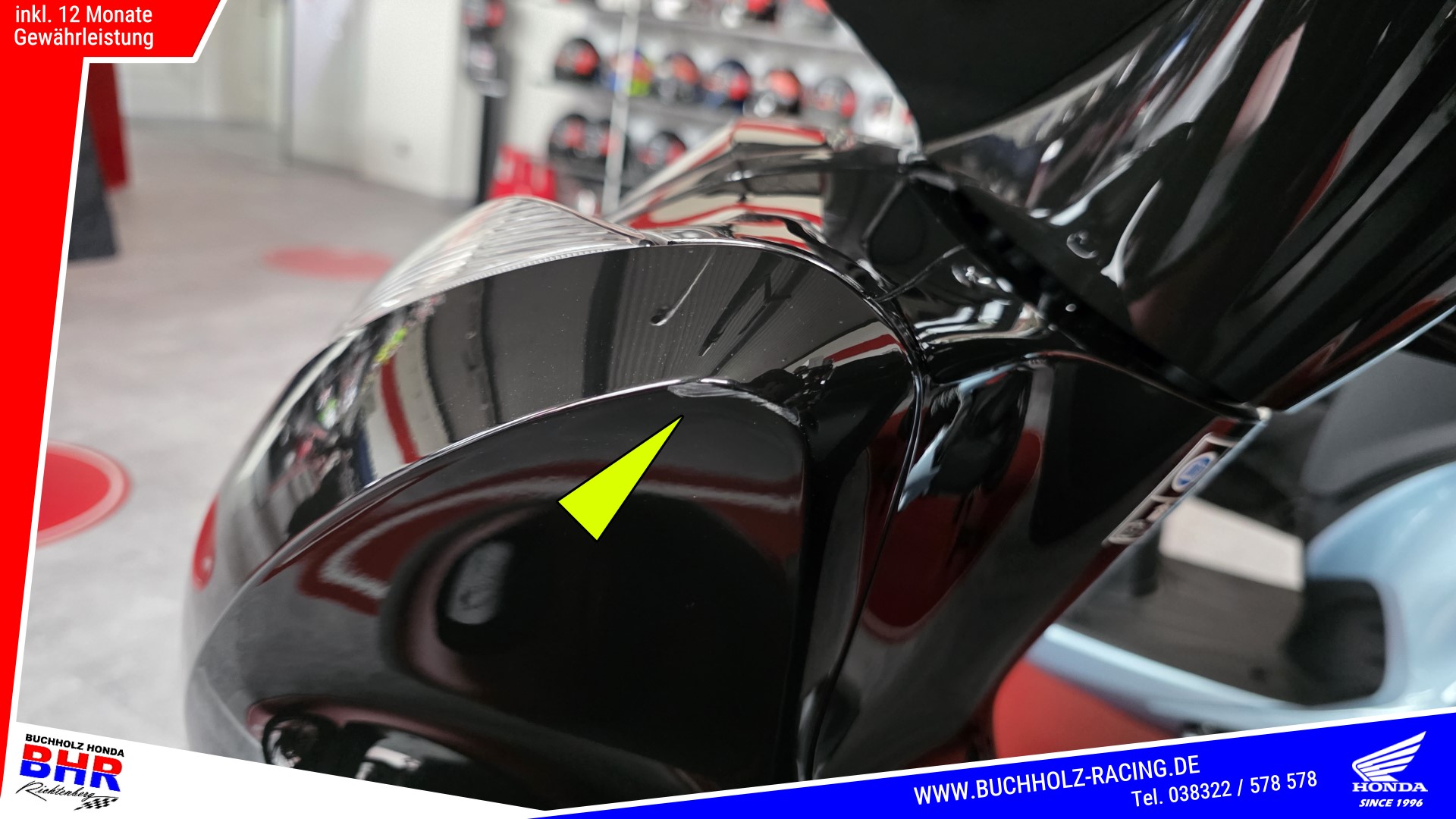 An der Verkleidung oben links ist eine kleine Schramme und am Auspuffschutz sind kleine Kratzer (siehe Bilder)