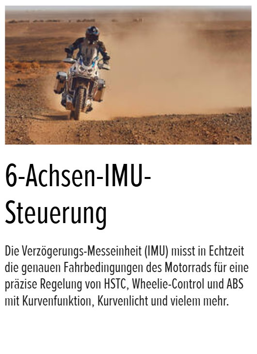 Moderne Elektronik mit 6-Achsen-Sensorik unterstützt das Fahrvergnügen und steigert die Sicherheit mit fünf Fahrmodi, Kurven-ABS und HSTC-Traktionskontrolle. Die Ausstattung mit Dual-LED-Scheinwerfer inklusive DRL-Tagfahrlicht, 6,5 Zoll TFT-Touchscreen, Heizgriffen, Tempomat, Kurvenlicht, USB-Anschluss sowie 12 Volt-Bordsteckdose runden Bluetooth-Konnektivität mit Apple CarPlay und Android Auto ab.