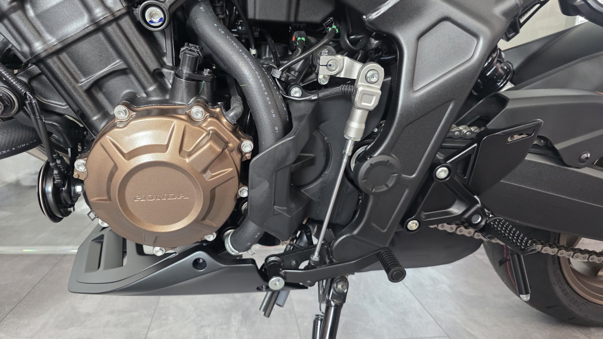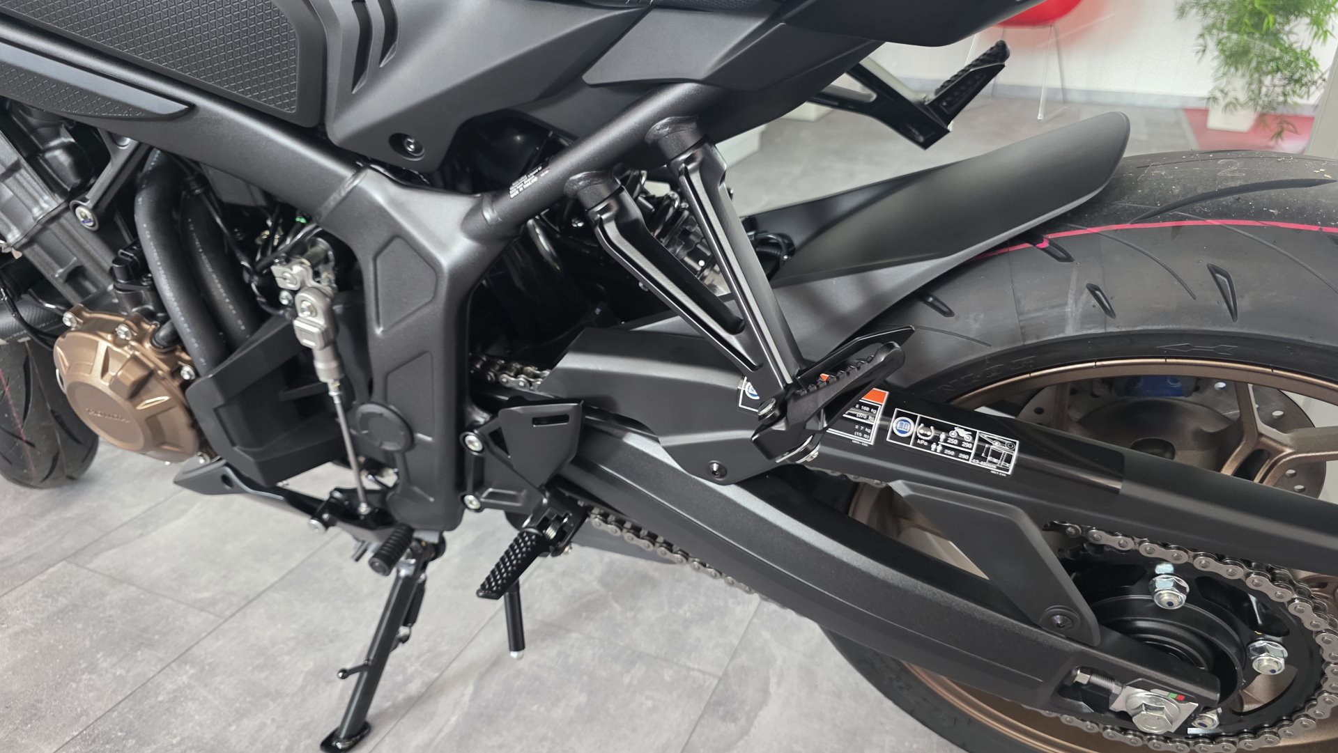 Du hast es in der Hand. Der DOHC-Vierzylinder-Reihenmotor leistet in der Spitze 70 kW (95,2 PS) – der rote Bereich beginnt bei 12.000 U/min – und bietet ein Drehmoment von 63 Nm. Honda Händler können das Bike für alle mit A2-Führerschein auf 35 kW drosseln und die Drosselung entfernen, sobald ein A1-Führerschein vorgelegt werden kann. Da Leistung Kontrolle braucht, verhindert die Anti-Hopping-Kupplung das Blockieren des Hinterrads bei starkem Bremsen und Herunterschalten. Das Notbremssignal (ESS) wird bei Vollbremsungen aktiviert und sorgt so für bessere Sichtbarkeit auf der Straße.