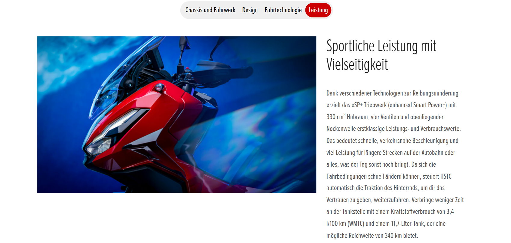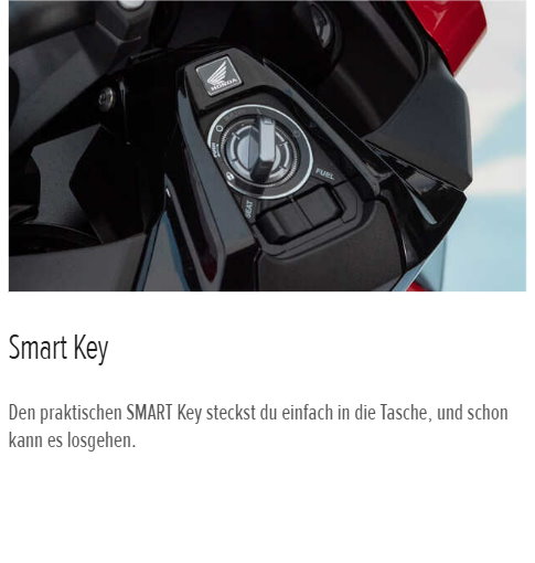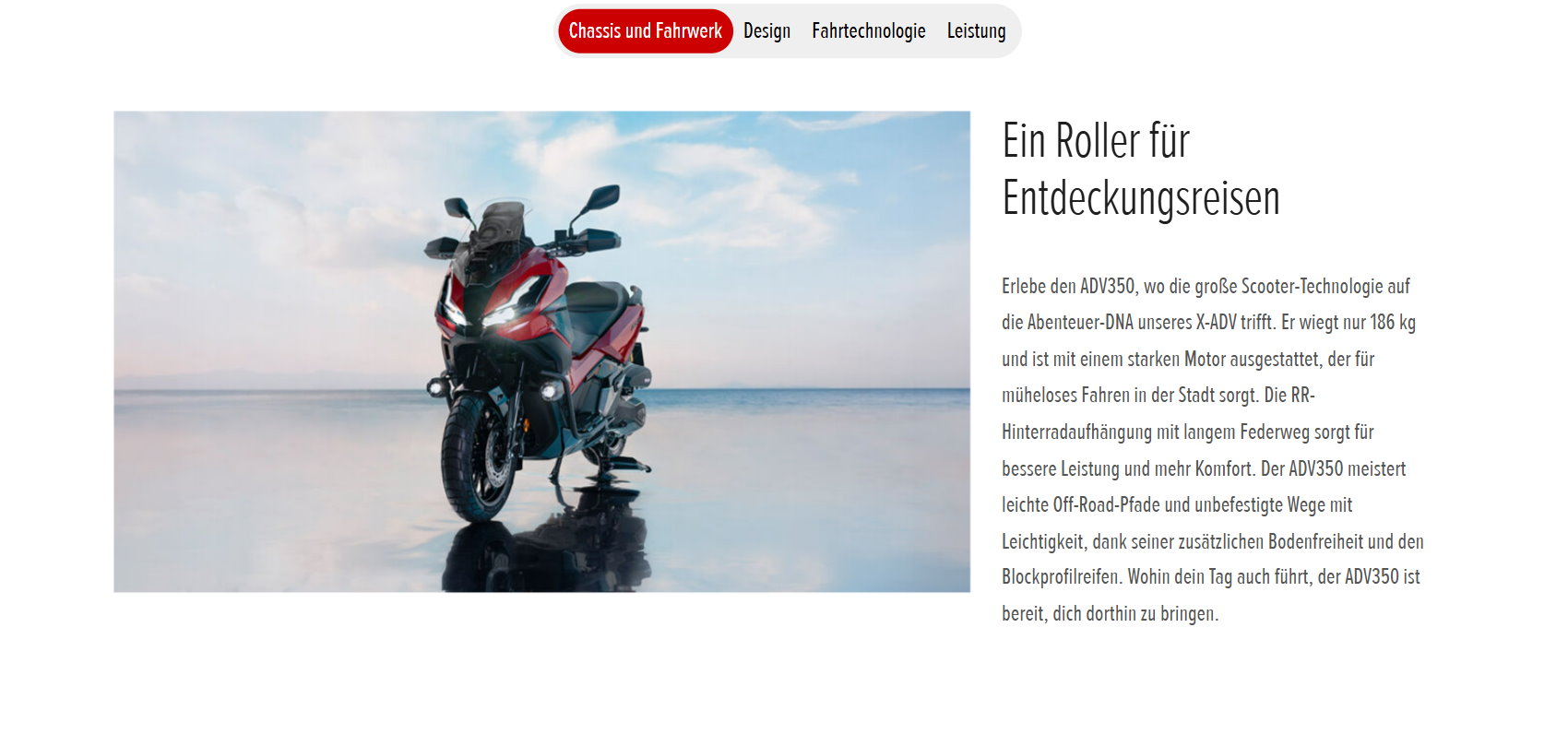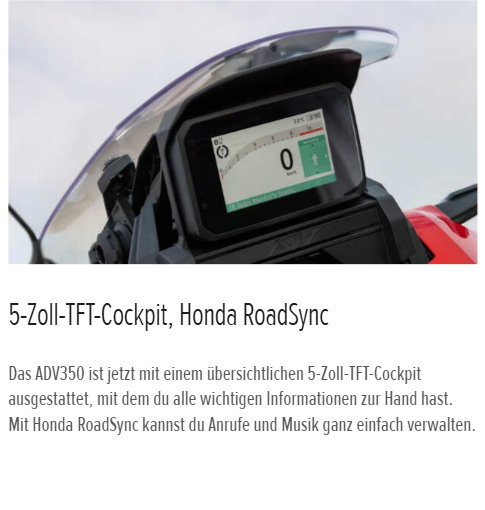 Zuversicht. Fühle es, wenn du den ADV350 Scooter fährst. Sportliche Motorleistung trifft auf ein robustes, leichtgängiges Fahrwerk und eine neue Hinterradaufhängung für mehr Komfort, um das Gelände mit Leichtigkeit zu bewältigen. Mit der automatischen Blinkerabschaltung ist der ADV350 nicht nur sicher, sondern auch funktional. Es geht aber nicht nur um Muskeln. Mit dem außerordentlich übersichtlichen 5-Zoll-TFT-Cockpit hast du während der Fahrt stets alles im Blick und dank Honda RoadSync-Integration jederzeit Zugriff auf Telefonanrufe, Musik und Navigation. Der ADV350. Auf diesen Roller kannst du dich verlassen.