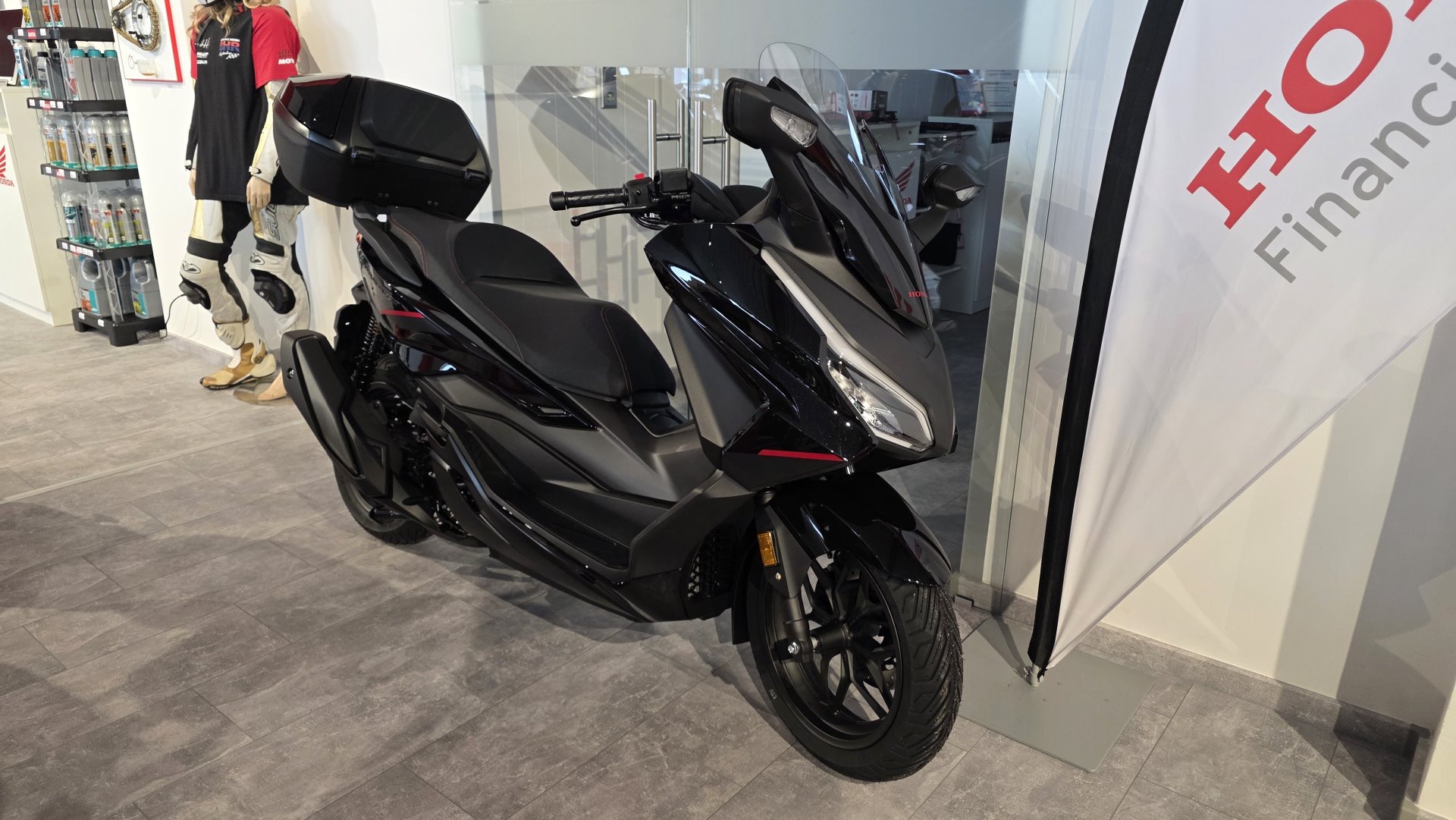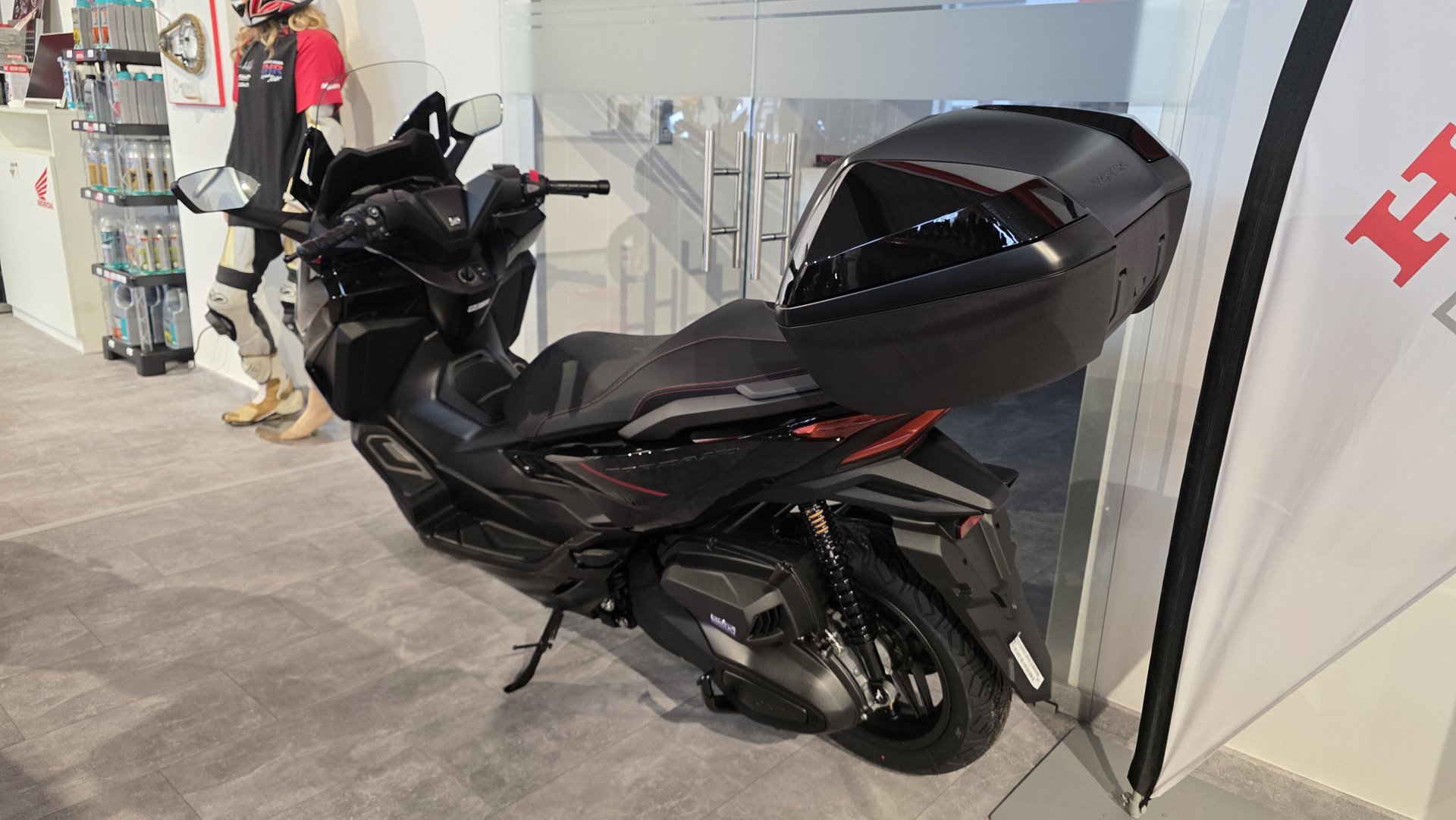 Die Special Edition-Variante des Forza 350 in exklusivem „Pearl Nightstar Black“ ist mit roten Grafikdekor, Sitzbank-Steppnähten & Trittbrettverkleidung ausgestattet.