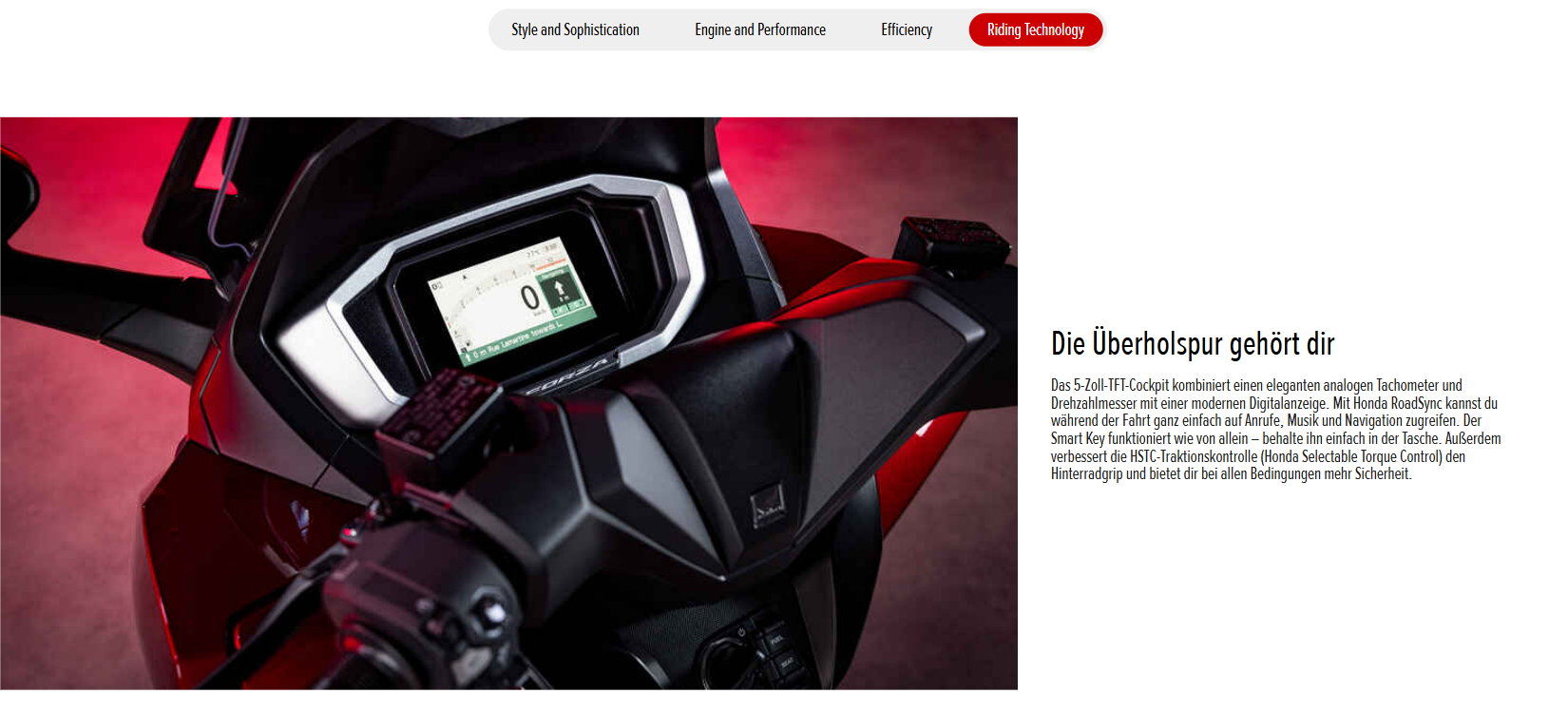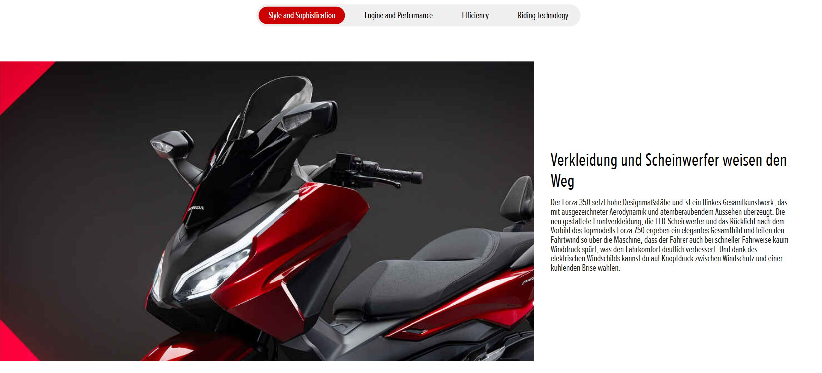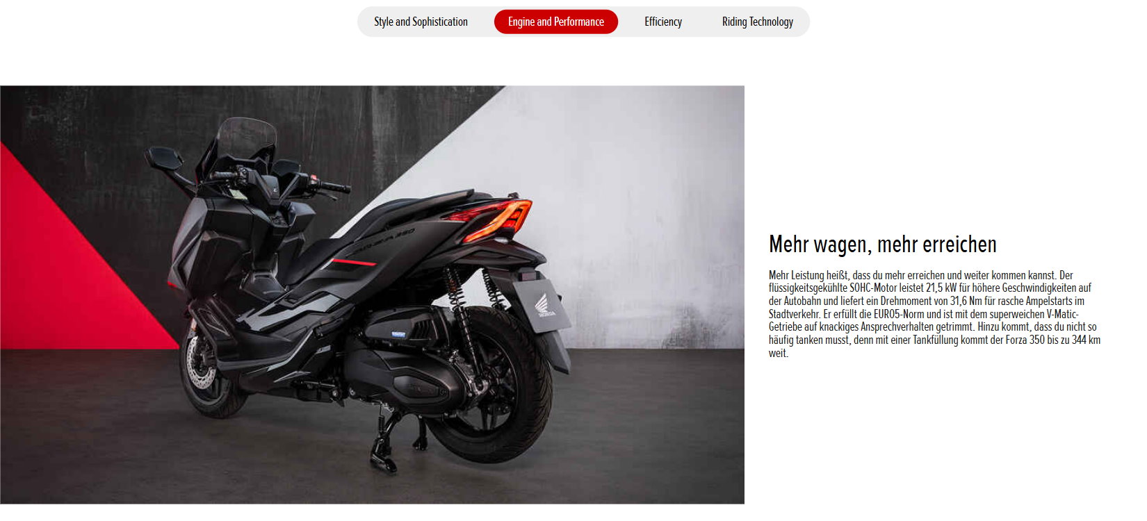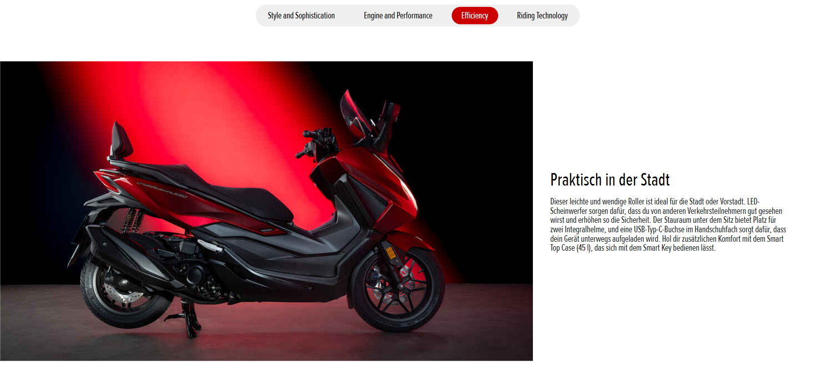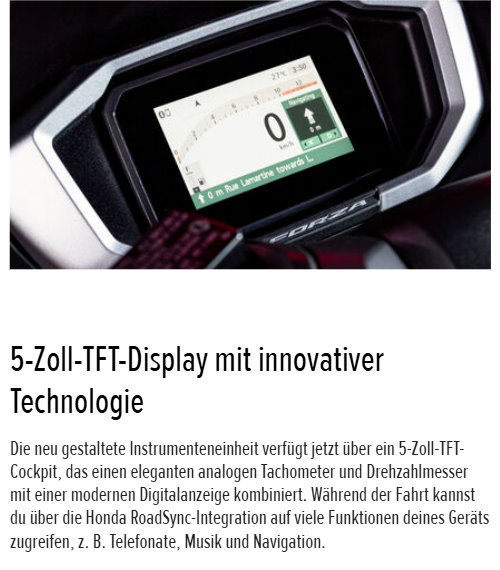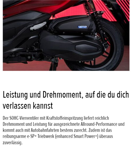 Der Forza 350 ist ein echter Sport-GT-Roller mit kraftvoller Motorleistung, HSTC für sicheres Fahren und exzellenter Kraftstoffeffizienz – und das alles in einem schlanken Design mit großzügigem Stauraum unter dem Sitz. Mit dem 5-Zoll-TFT-Bildschirm und der Honda RoadSync-Integration bleibst du den ganzen Tag über in Verbindung und hast während der Fahrt nahtlosen Zugang zu Anrufen, Musik und Navigation.