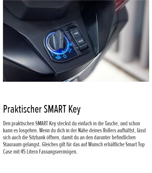 Mit dem SMART Key hast du nicht nur Zugriff auf die Zündung und die Staufachverriegelung, sondern auch auf das serienmäßige Smart Top Case mit 45 Litern Fassungsvermögen.