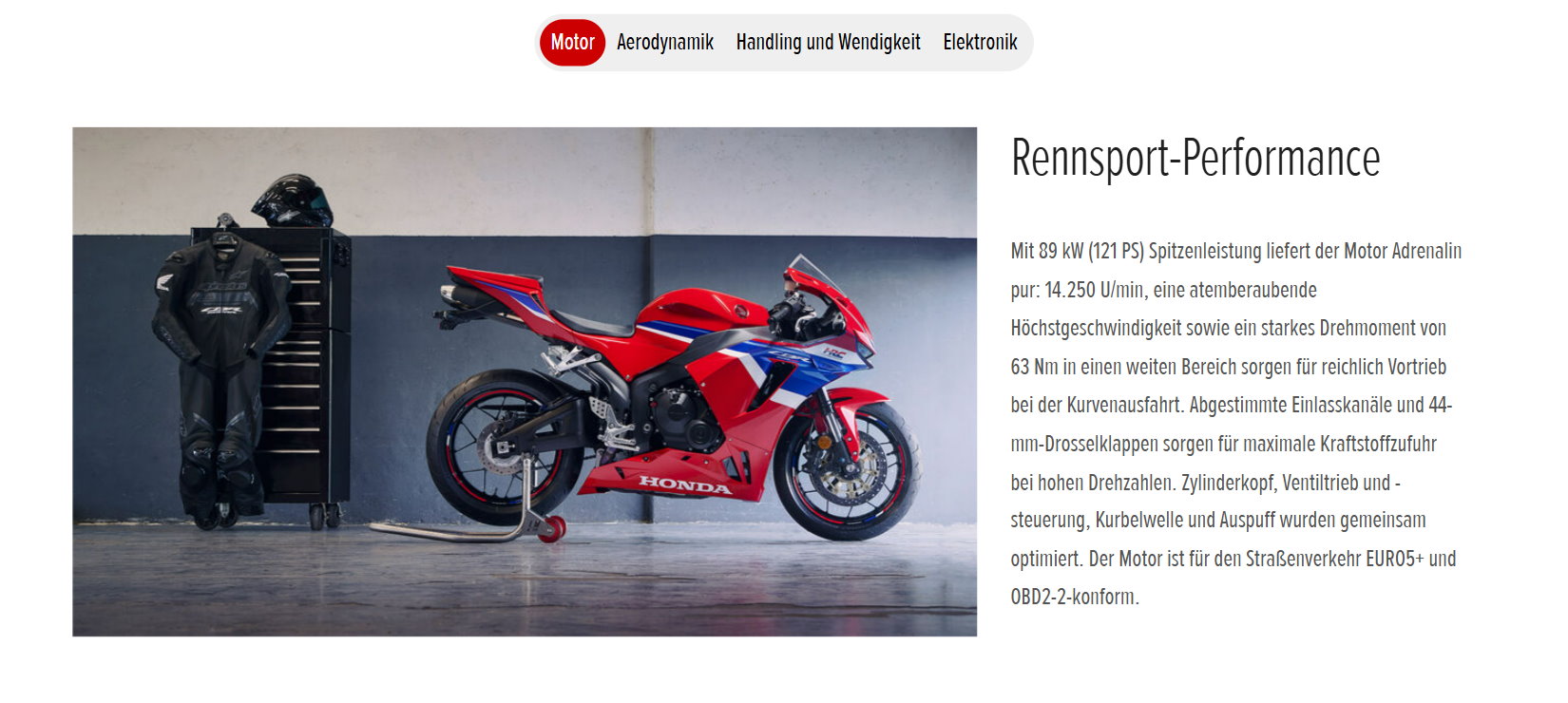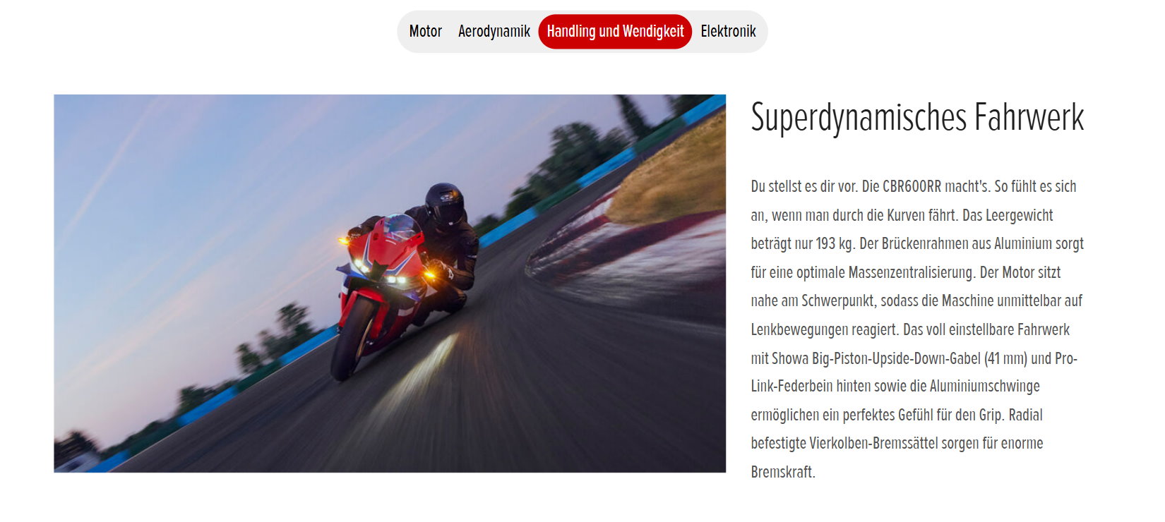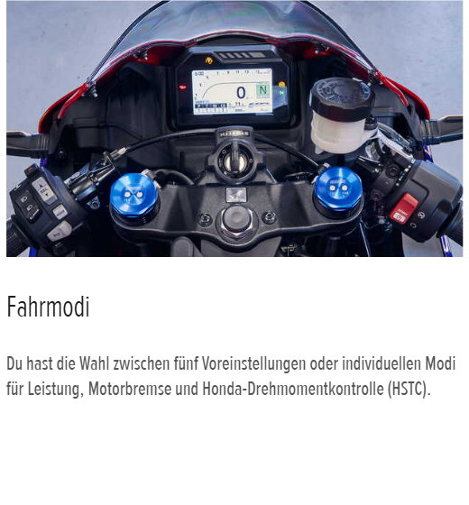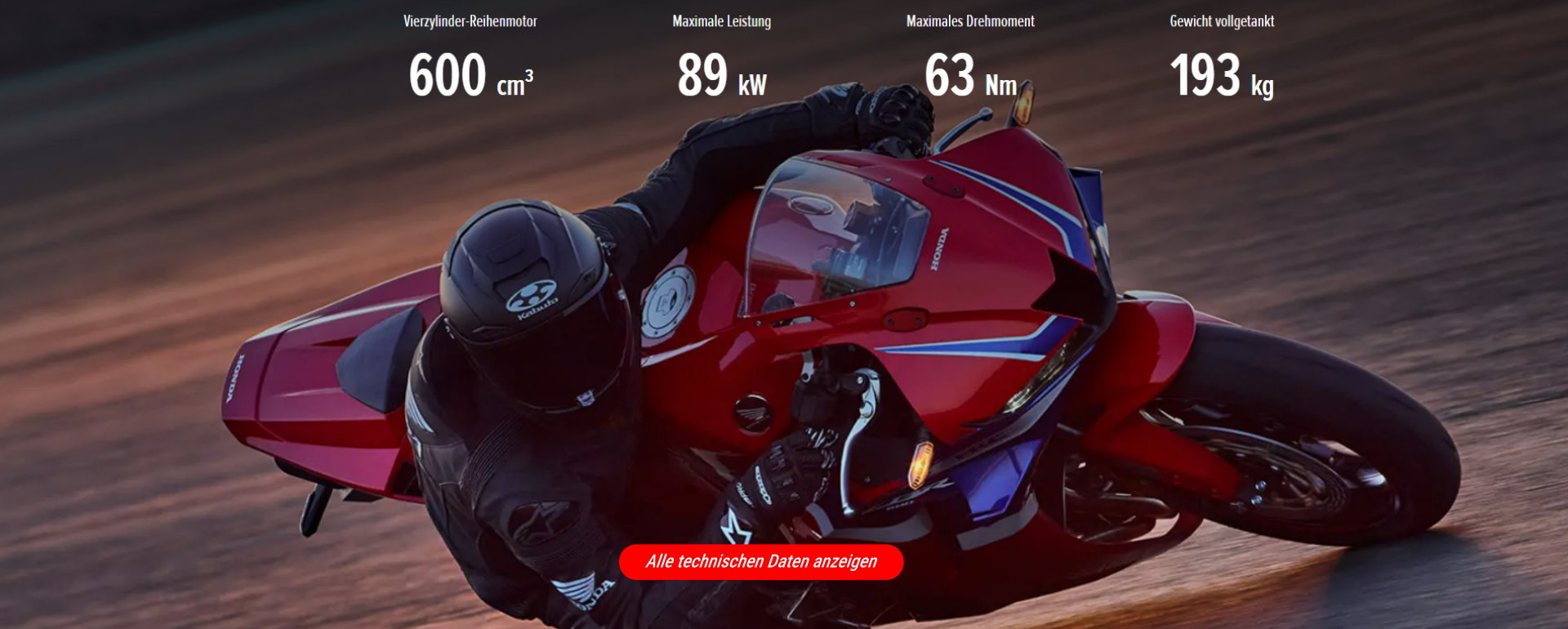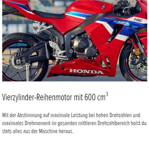 Für die Rennstrecke entwickelt. Angepasst an die Straße. Die neue CBR600RR ist eine kompromisslose HRC-Supersportmaschine mit einem leistungsstarken Vierzylindermotor und einem agilen Fahrwerk, das unmittelbar reagiert. Die Elektronik- und Aerodynamikpakete wurden direkt vom MotoGP-Bike RC213V-S übernommen. Du suchst nach Kontrolle auf einem ganz neuen Niveau? Du hast sie gefunden.