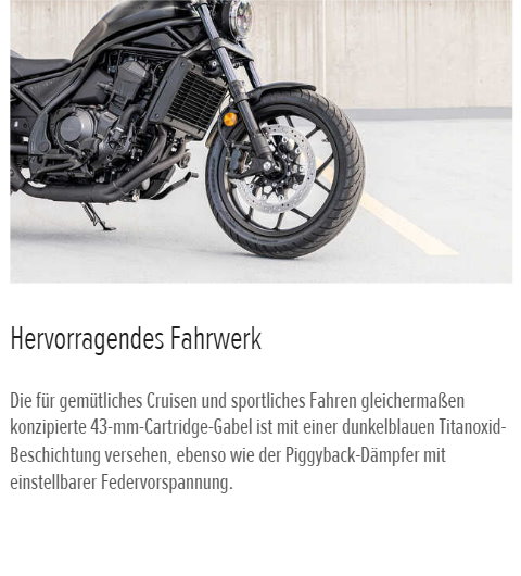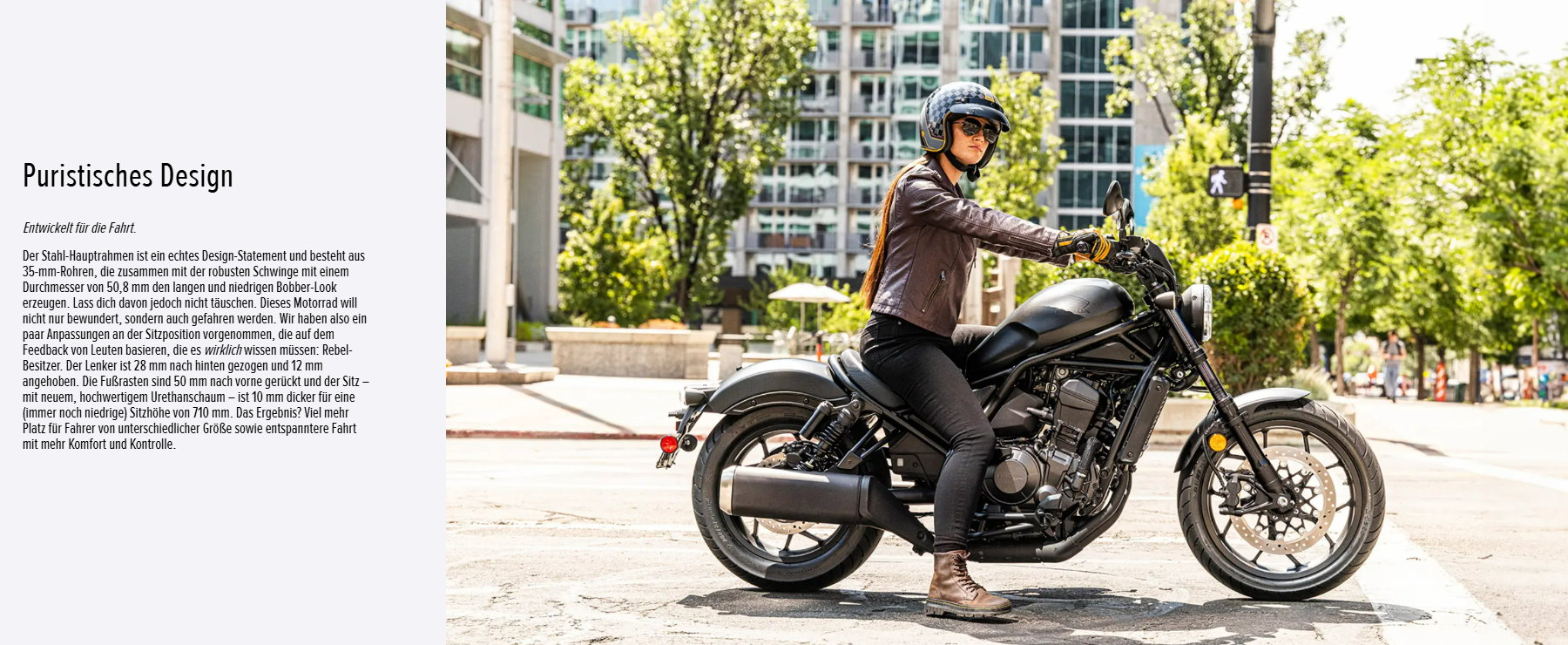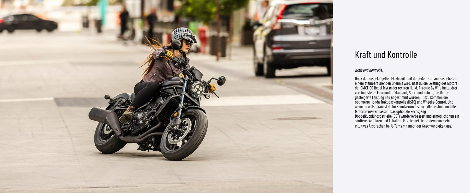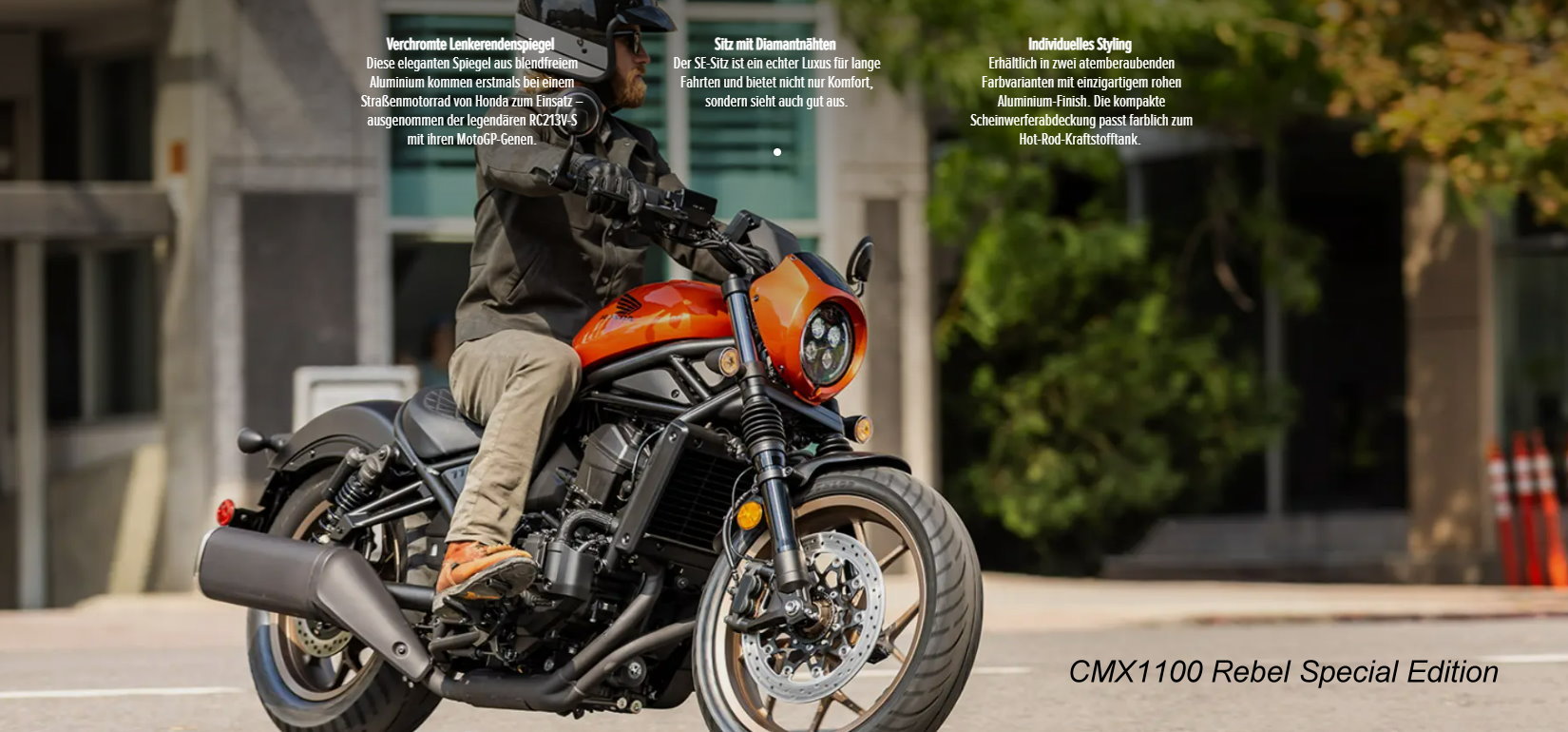 Es geht nicht nur darum, wo du gewesen bist. Es geht darum, wohin du gehst. Mit der neuen CMX1100 Rebel bist du auf der Straße unterwegs wie nie zuvor. Der charakterstarke Zweizylindermotor bringt mehr Leistung im niedrigen bis mittleren Drehzahlbereich mit. Die entspanntere Sitzposition mit erhöhtem und in Richtung des Fahrers nach hinten versetztem Lenker, nach vorn versetzten Fußrasten und 10 mm höherem Sitz bietet mehr Komfort und Sicherheit. Hinzu kommt das neue 5-Zoll-TFT-Display mit Smartphone-Konnektivität per Honda RoadSync, mit dem du unterwegs auf dem Laufenden bleibst.