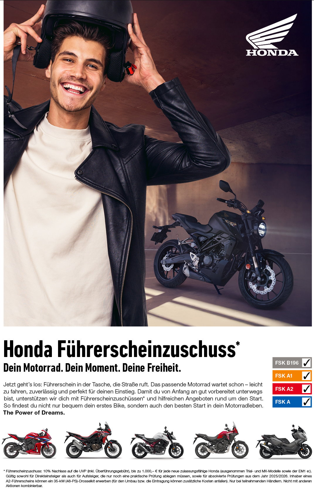 Auch 2026 unterstützt Honda Deutschland Fahranfänger und Aufsteiger beim Kauf einer neuen Maschine mit dem attraktiven Führerscheinzuschuss.