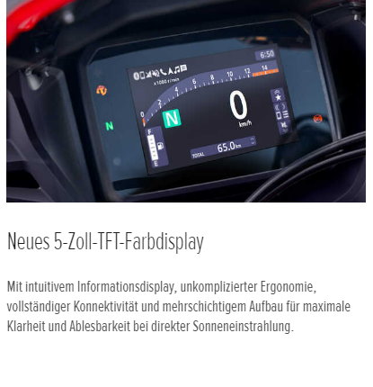 Zu dynamischer Performance erfüllt auch die trendige Optik mit Vollverkleidung supersportliche Ansprüche. Das 5 Zoll große TFT-Display integriert